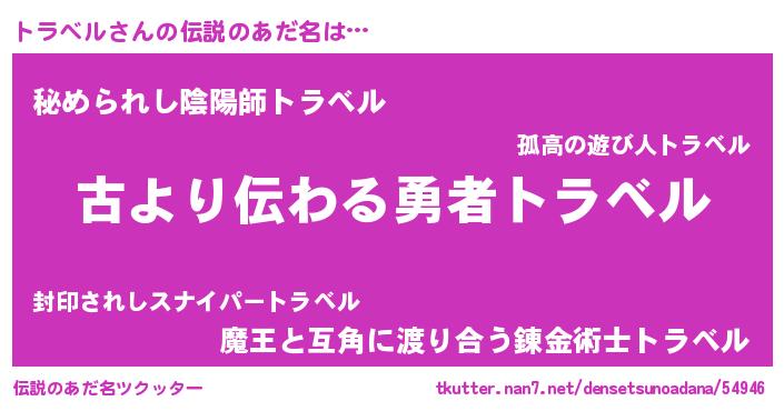 | 男性向けラノベタイトル風あだ名 | 『この素晴らしい世界にトラベルを!』 |