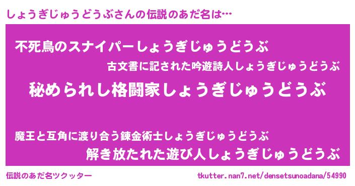 | 胡散臭い通販商品みたいなあだ名 | 『ガンによく効く高麗人参…その名も「しょうぎじゅうどうぶ」』 |