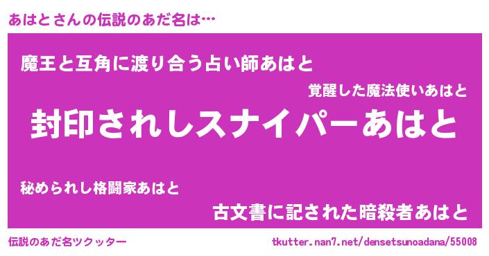 | 男性向けラノベタイトル風あだ名 | 『うちのあはとが世界を掌握している!』 |