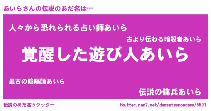 | 意味不明あだ名 | 『とにかく怪しいあいら』『自称あいら』 |