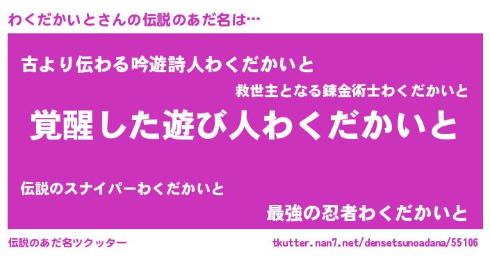 | 男性向けラノベタイトル風あだ名 | 『わくだかいとの嫁は女の子じゃないと思った?』 |