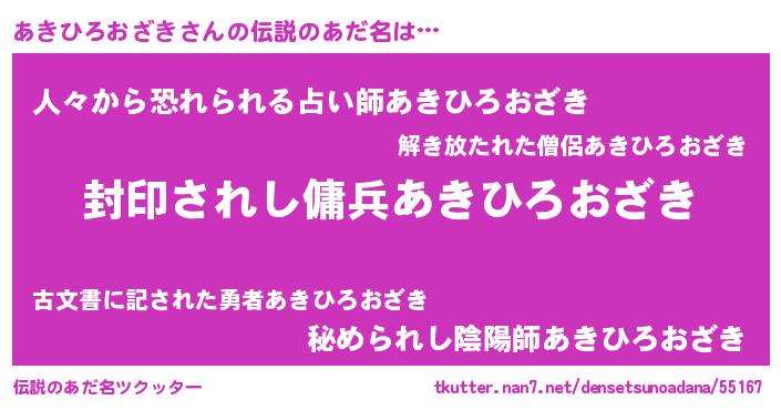 | 男性向けラノベタイトル風あだ名 | 『アキヒロオザキアートオンライン』 |