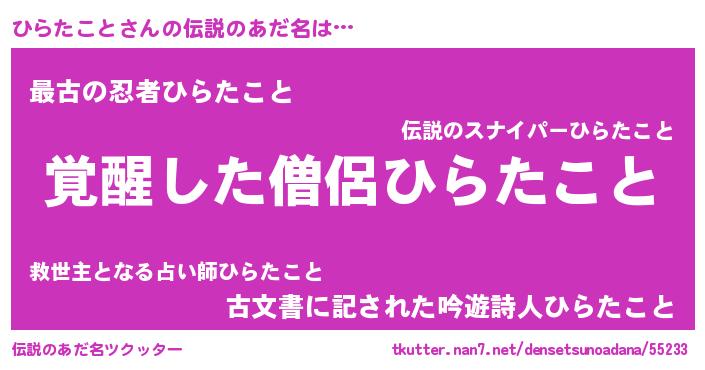 | ヒーロー風カッコイイあだ名 | 『天弓騎士ヒラ』『ネオヒラタコト』 |