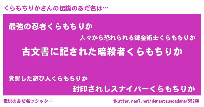 | 胡散臭い通販商品みたいなあだ名 | 『前代未聞の健康食品…その名も「くらもちりか」』 |