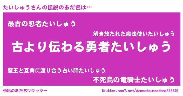 | ヒーロー風カッコイイあだ名 | 『ネオタイシュウ』『仮面タイダー』 |