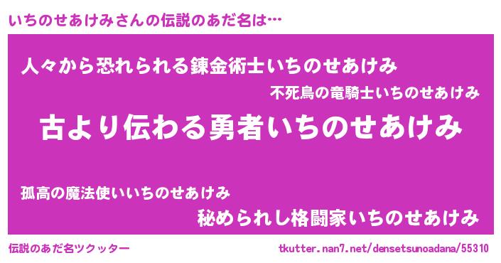 | 胡散臭い通販商品みたいなあだ名 | 『来世でも幸せになれる水素水…その名も「いちのせあけみ」』 |