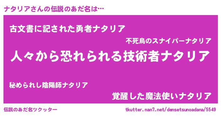 | ヒーロー風カッコイイあだ名 | 『正義の使者ナタリア』『ネオナタリア』 |