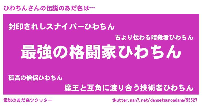 | 男性向けラノベタイトル風あだ名 | 『Re:ひわちんから始める異世界生活』 |