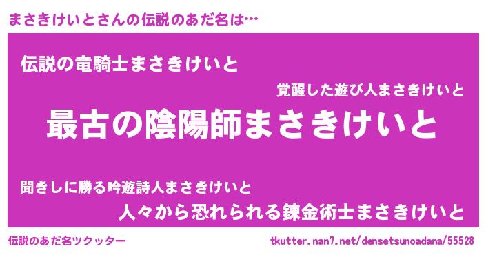 | 男性向けラノベタイトル風あだ名 | 『この素晴らしい世界にまさきけいとを!』 |