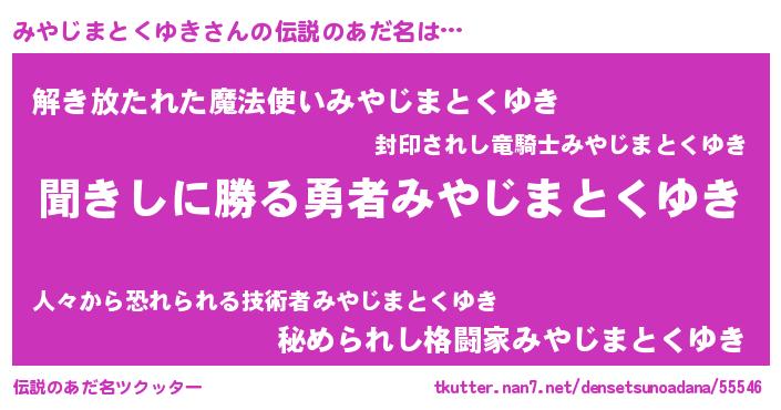 | ヒーロー風カッコイイあだ名 | 『ネオミヤジマトクユキ』『魔戒騎士ミヤ』 |