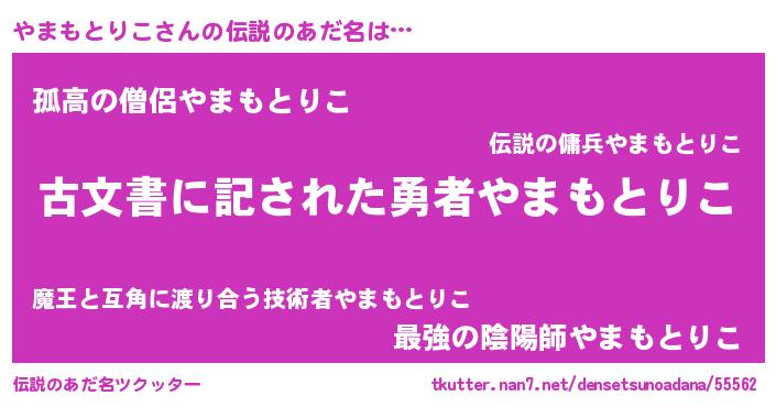 | 男性向けラノベタイトル風あだ名 | 『やまもとりこ~年齢イコール彼女いない歴の魔法使い~』 |
