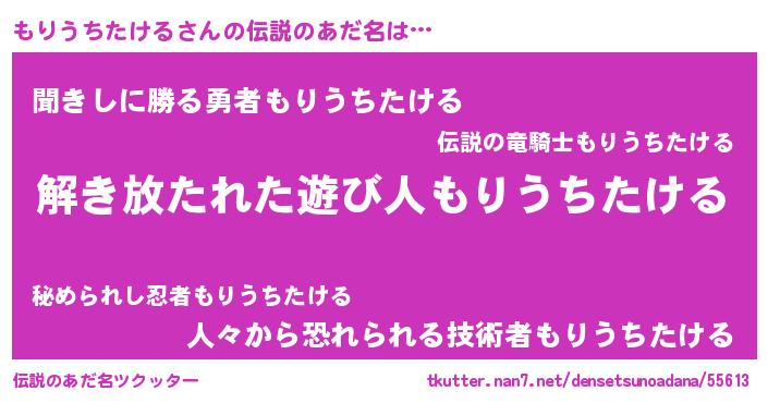 | 男性向けラノベタイトル風あだ名 | 『もりうちたけるの嫁は女の子じゃないと思った?』 |