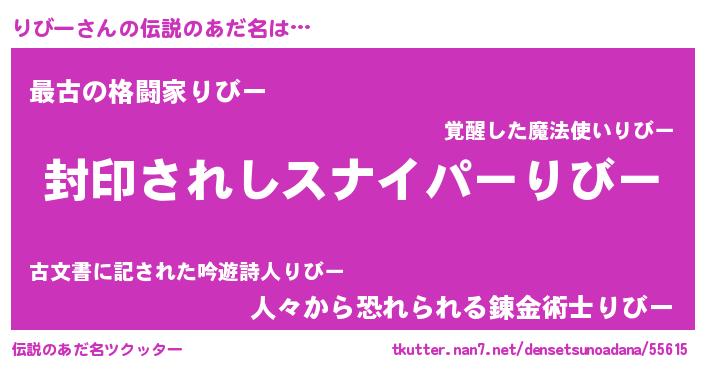 | 男性向けラノベタイトル風あだ名 | 『りびーに滅ぼされるだけの簡単なお仕事です』 |