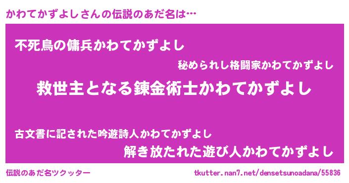 | 男性向けラノベタイトル風あだ名 | 『ノーゲーム・ノーカワテカズヨシ』 |
