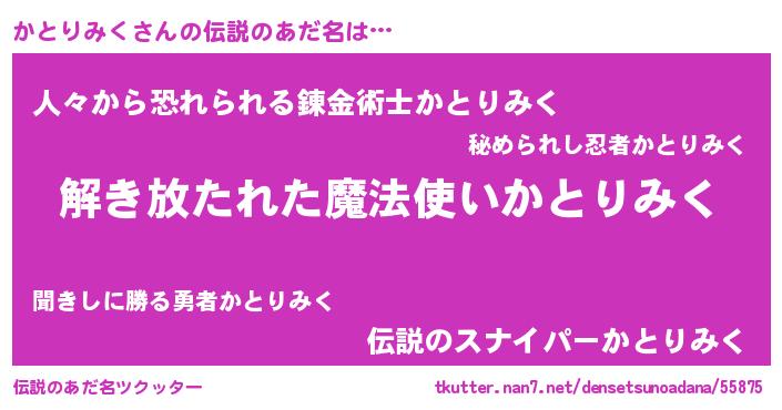 | ヒーロー風カッコイイあだ名 | 『銀牙騎士カト』『正義の使者かとりみく』 |