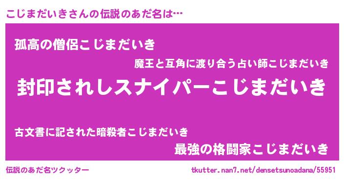 | 男性向けラノベタイトル風あだ名 | 『こじまだいき~年齢イコール彼女いない歴の魔法使い~』 |