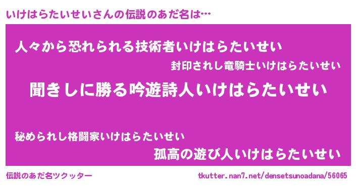 | ヘコむあだ名 | 『いけはらたいせい(小並感)』『いけお』 |