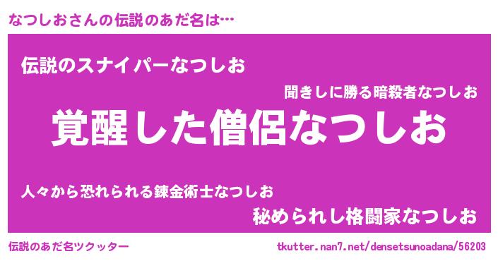 | 男性向けラノベタイトル風あだ名 | 『なつしおの嫁は女の子じゃないと思った?』 |