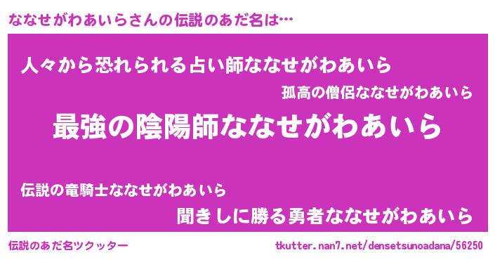 | 男性向けラノベタイトル風あだ名 | 『この素晴らしい世界にななせがわあいらを!』 |