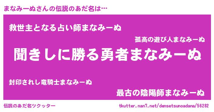 | 男性向けラノベタイトル風あだ名 | 『まなみーぬという概念が存在しない退屈な世界 』 |