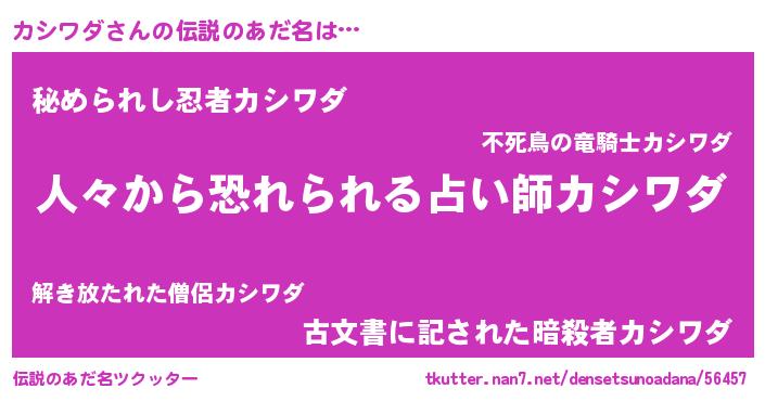 | 男性向けラノベタイトル風あだ名 | 『おまえをオタクにしてやるから、俺をカシワダにしてくれ! 』 |