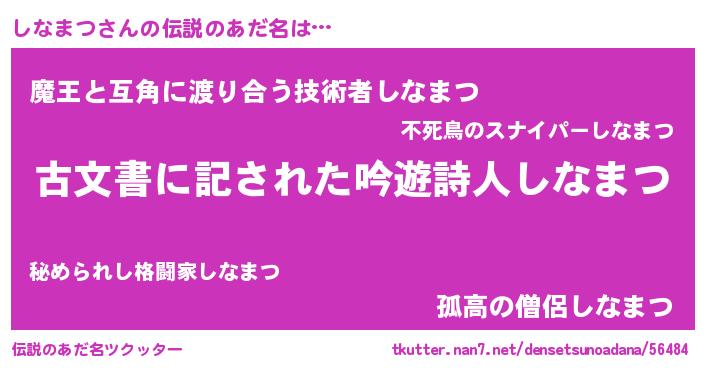 | 男性向けラノベタイトル風あだ名 | 『しなまつに滅ぼされるだけの簡単なお仕事です』 |