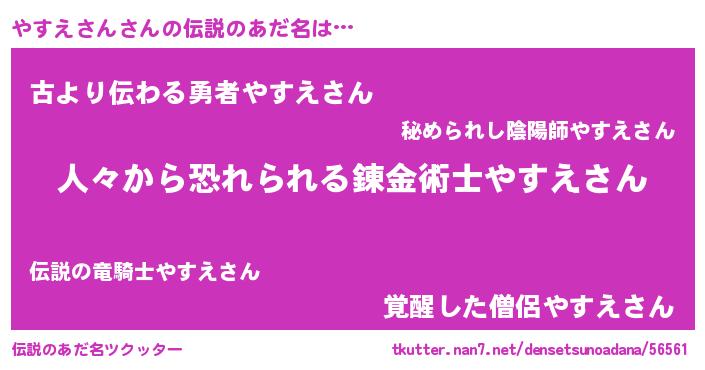 | 男性向けラノベタイトル風あだ名 | 『おまえをオタクにしてやるから、俺をやすえさんにしてくれ! 』 |
