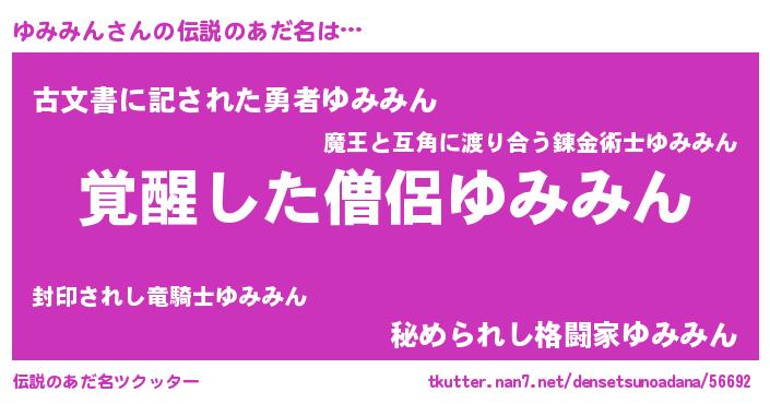 | ヒーロー風カッコイイあだ名 | 『炎刃騎士ユミ』『ネオユミミン』 |