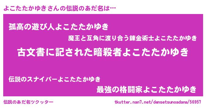 | ヒーロー風カッコイイあだ名 | 『ネオヨコタタカユキ』『黄金騎士ヨコ』 |