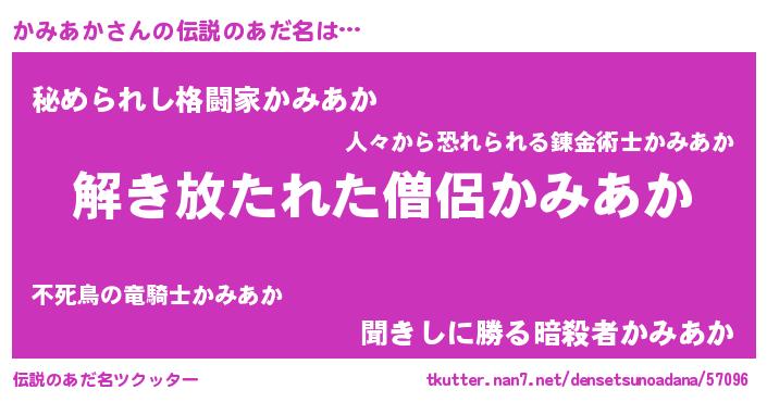 | ヒーロー風カッコイイあだ名 | 『仮面カミダー』『超時空戦士カミアカ』 |