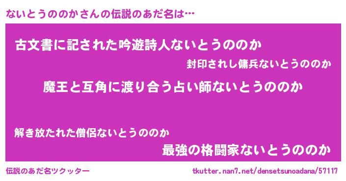 | 女子向けラノベタイトル風あだ名 | 『ないとうののか恋絵巻』 |