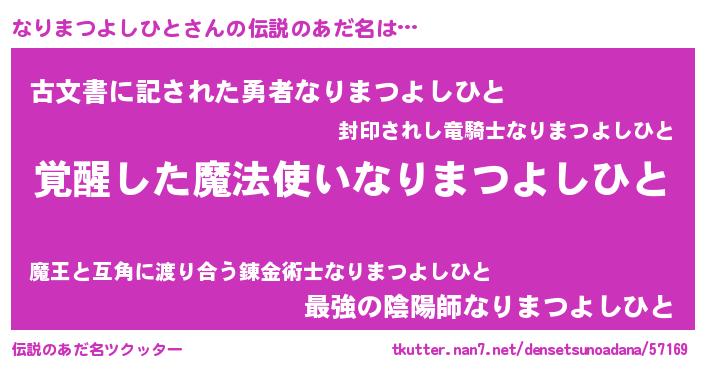 | 男性向けラノベタイトル風あだ名 | 『うちのなりまつよしひとが世界を掌握している!』 |