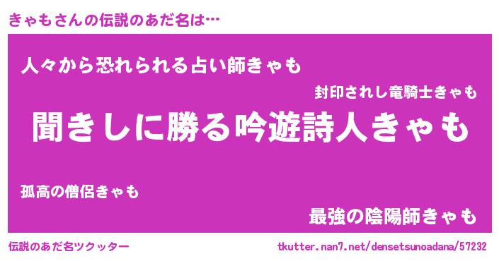 | 意味不明あだ名 | 『めかぶ科きゃも属』『永久保存きゃも』 |