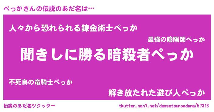 | 男性向けラノベタイトル風あだ名 | 『ぺっかという概念が存在しない退屈な世界 』 |