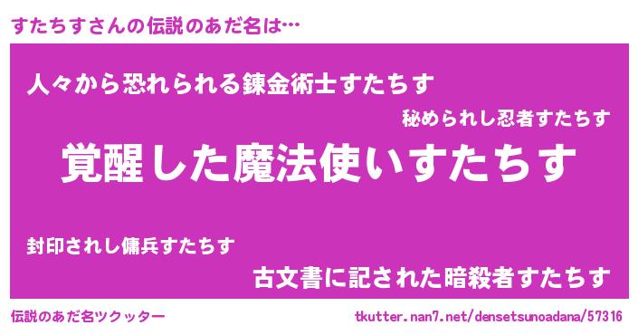 | ヒーロー風カッコイイあだ名 | 『天弓騎士スタ』『正義の使者すたちす』 |