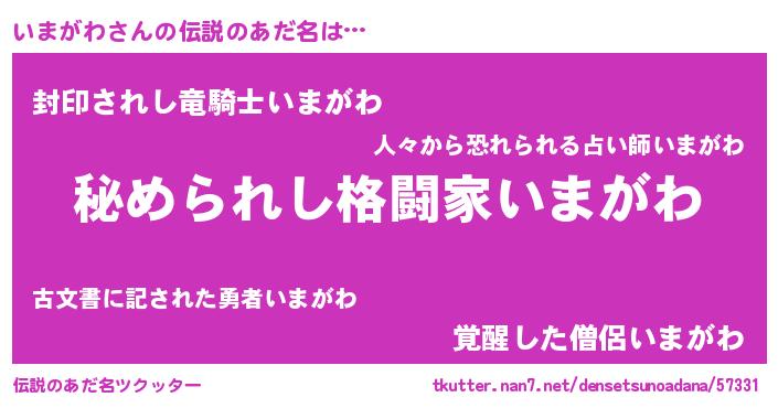 | ヒーロー風カッコイイあだ名 | 『仮面イマダー』『超時空戦士イマガワ』 |