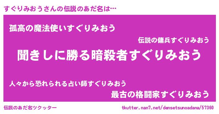 | 男性向けラノベタイトル風あだ名 | 『すぐりみおうという概念が存在しない退屈な世界 』 |