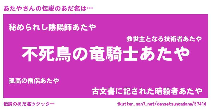 | 男性向けラノベタイトル風あだ名 | 『魔弾の王とあたや』『あたやの憂鬱』 |