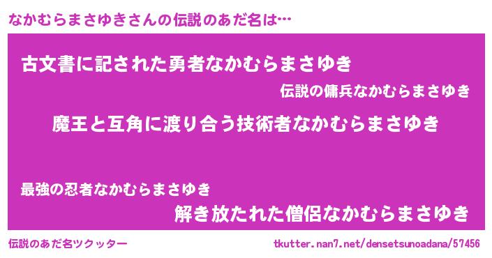 | 男性向けラノベタイトル風あだ名 | 『転生したらなかむらまさゆきだった件』 |
