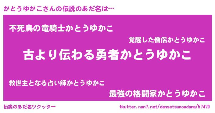| ヒーロー風カッコイイあだ名 | 『ネオカトウユカコ』『炎刃騎士カト』 |
