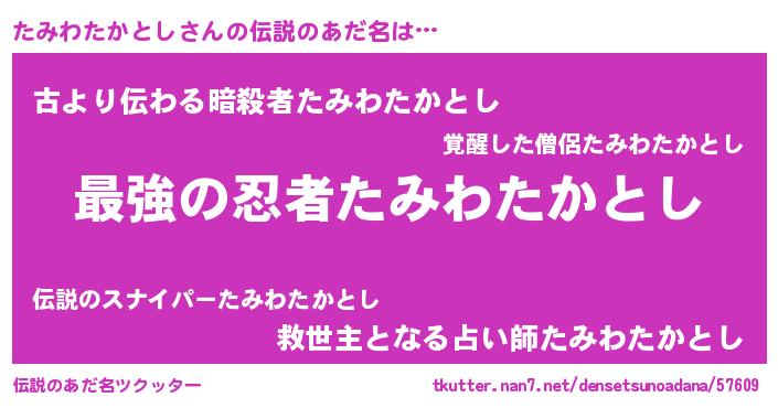 | 男性向けラノベタイトル風あだ名 | 『たみわたかとし~年齢イコール彼女いない歴の魔法使い~』 |