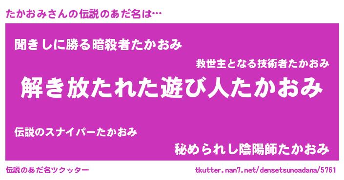 | 女子向けラノベタイトル風あだ名 | 『たかおみの卵を拾いまして』 |
