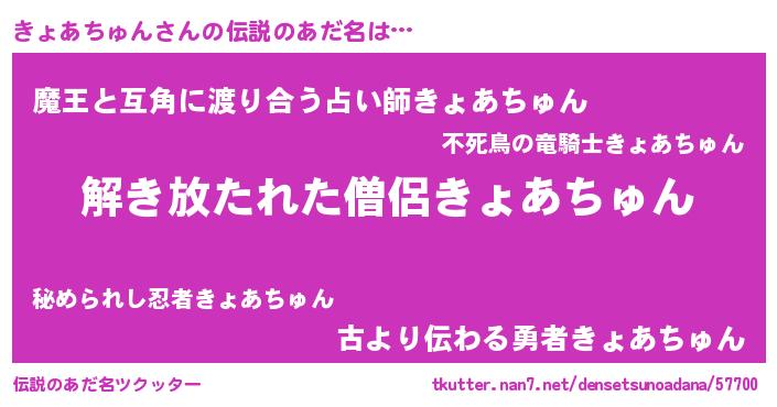 | 男性向けラノベタイトル風あだ名 | 『魔弾の王ときょあちゅん』 |