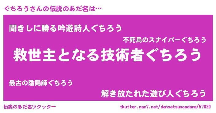 | 男性向けラノベタイトル風あだ名 | 『ぐちろう~年齢イコール彼女いない歴の魔法使い~』 |