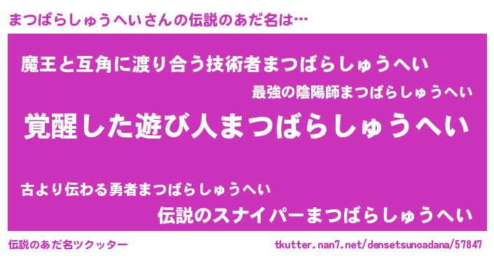 | 男性向けラノベタイトル風あだ名 | 『うちのまつばらしゅうへいが世界を掌握している!』 |