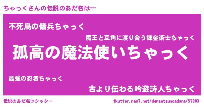 | 男性向けラノベタイトル風あだ名 | 『チャックスレイヤー』『ちゃっくの憂鬱』 |