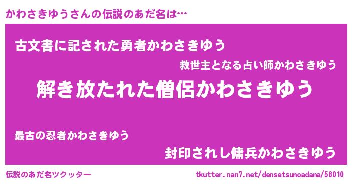| ヒーロー風カッコイイあだ名 | 『幻影騎士カワ』『ネオカワサキユウ』 |