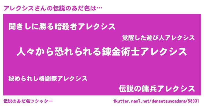 | ヒーロー風カッコイイあだ名 | 『正義の使者アレクシス』『仮面アレダー』 |