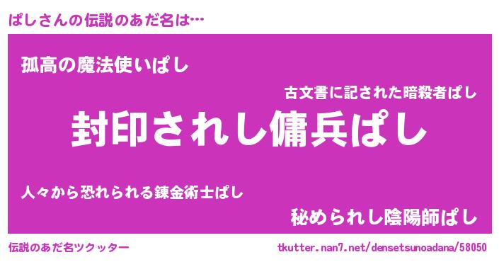 | 男性向けラノベタイトル風あだ名 | 『ぱし~年齢イコール彼女いない歴の魔法使い~』 |
