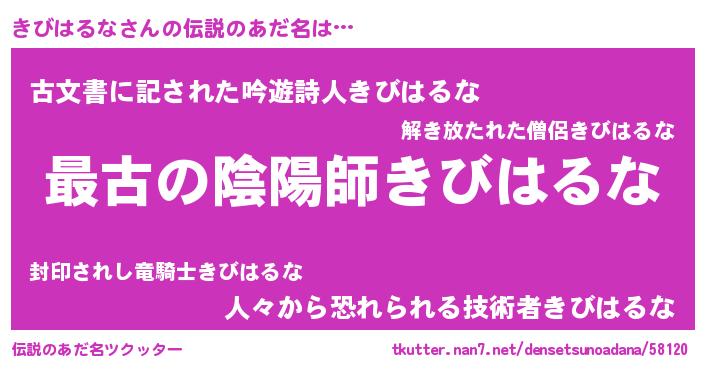 | ヒーロー風カッコイイあだ名 | 『仮面キビダー』『ネオキビハルナ』 |